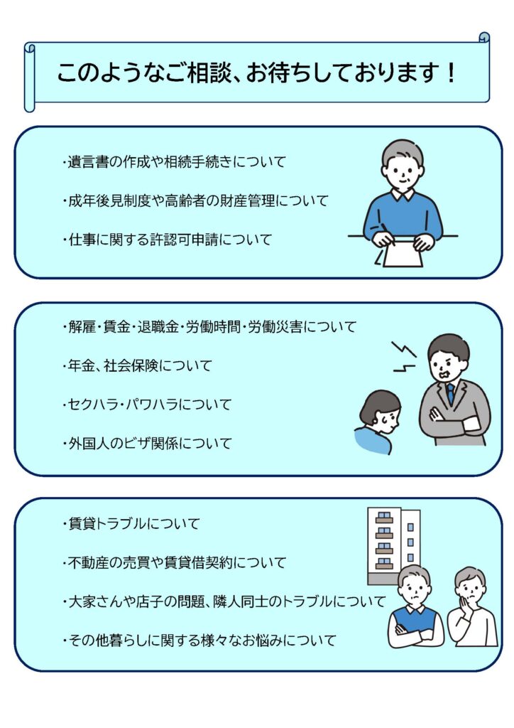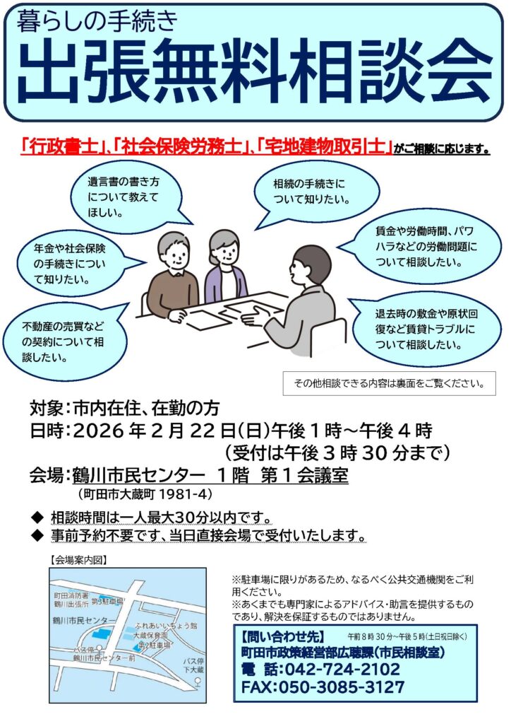 町田地区では、行政書士会町田支部および宅地建物取引業協会町田支部と合同で、市民向け無料相談会を開催いたします(町田市共催)。